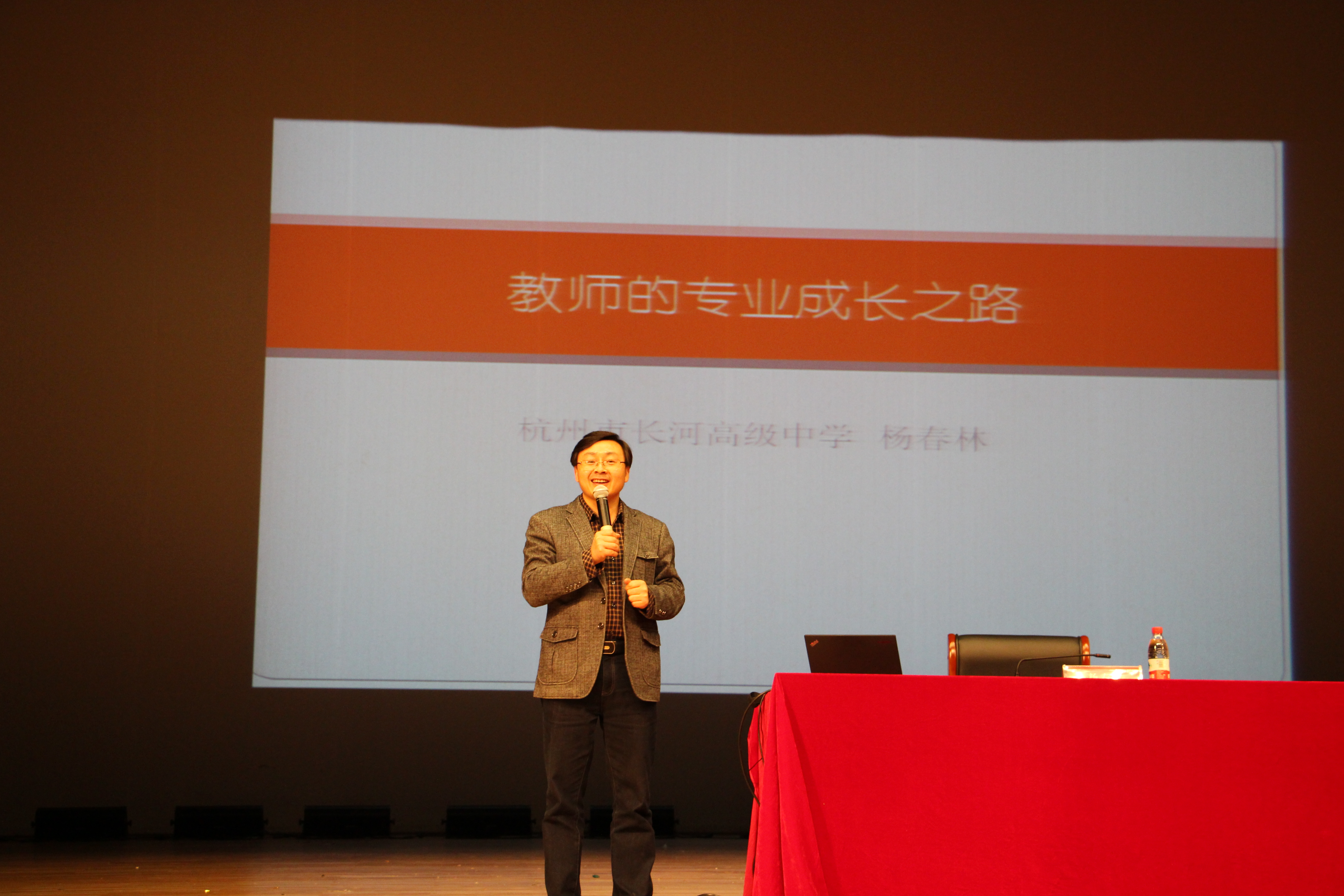 2015年11月2日,“员工会客室”开讲。邀请全国知名班主任工作教师,全国语文“新星杯”教学大赛高中组一等奖获得者,杭州市教坛新秀杨春林员工返校,为员工们开设了题为“教师的专业成长之路”的专题报告。报告中,杨老师从自己如何走上教师之路导入主题,阐述了教师教育中的种种案例,教育同学们坚定自己要走的路,并一如既往的努力;并同时强调大家要多读书,多走路,开阔眼界和视野,寻找正确的发展路径,为将来打下坚实的基础。