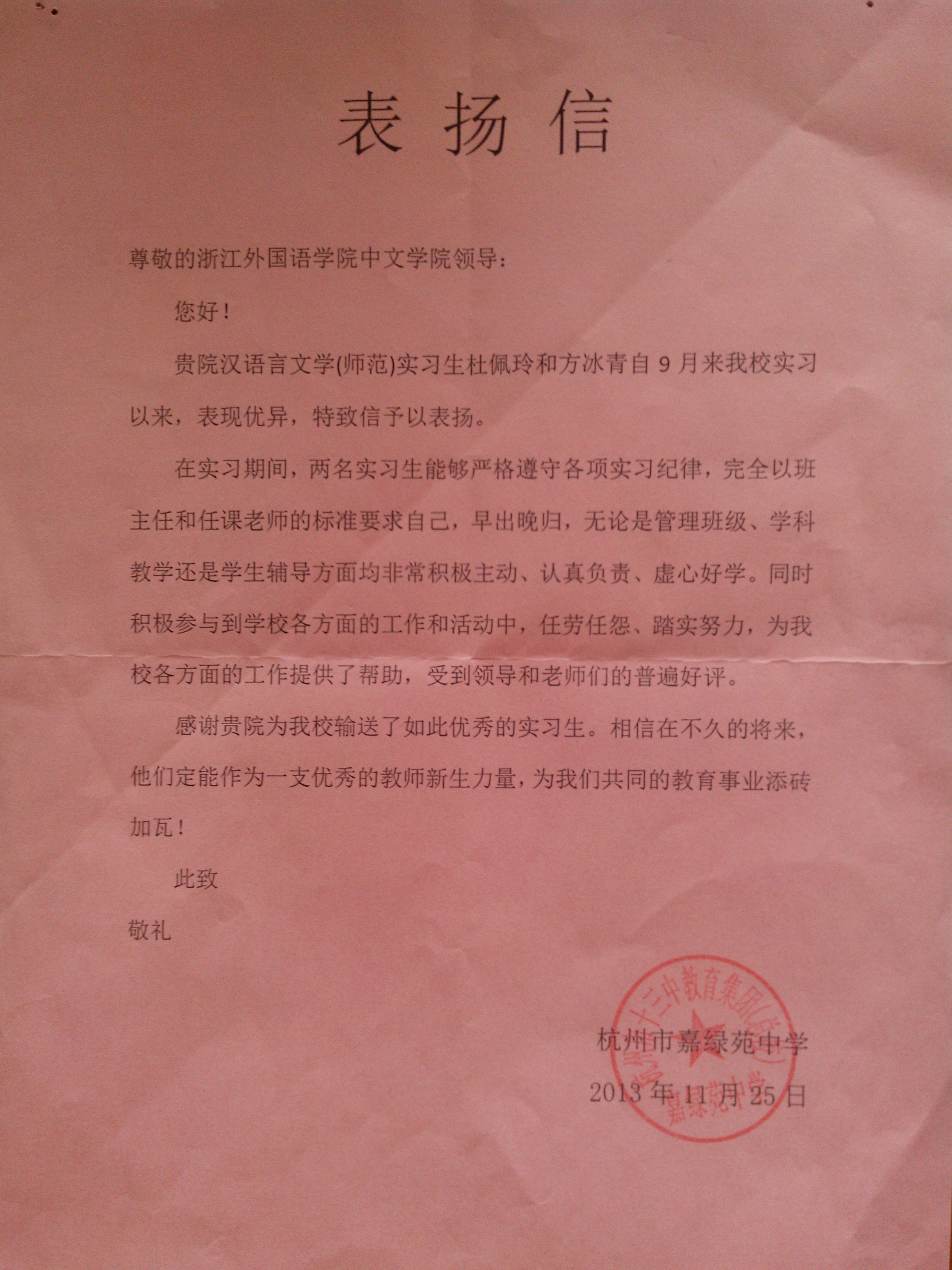 公司2014届师范生教育实习刚刚结束,就收到了来自杭州市嘉绿苑中学的一封表扬信。