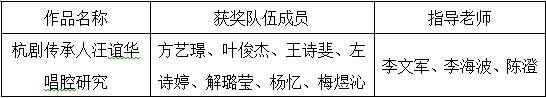 在本次竞赛中,公司16级网络与新媒体班解璐莹和17级汉语言文学(师范)2班梅煜沁参与的艺术学院团队作品《杭剧传承人汪谊华唱腔研究》,通过激烈竞争和层层选拔,最终荣获省赛一等奖。恭喜这只获奖团队,希望各位同学向他们学习,以创新热情和实干精神投入于今后的学习实践中。