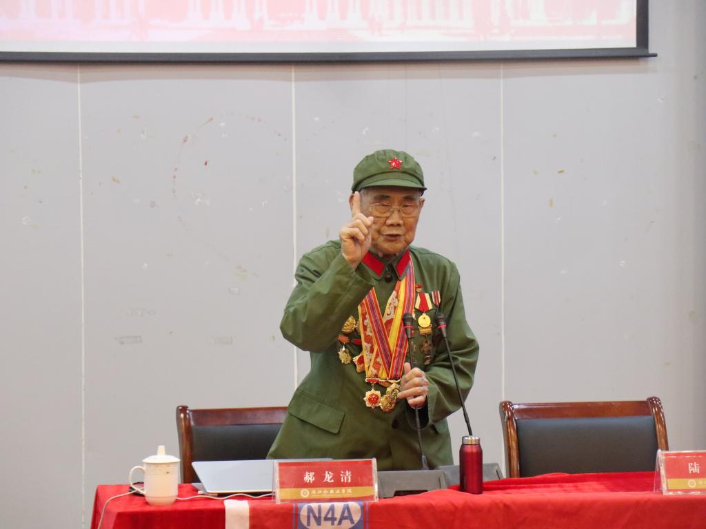 老党员郝龙清出生于1929年,1944年加入八路军,先后参加了抗日战争、解放战争、抗美援朝战争,后成长为一名飞行员,1979年退役转业,已具有73年党龄。郝老以《致敬——伟大的党》为题,结合抗美援朝等亲历亲闻,带大家了解了那段烽火连天岁月里党领导军民英勇斗争的故事,以忠诚、真挚的情感,带大家自信、坚定回顾了我们党救国、建国、富国、强国的历史,使师生党员们明白到,在我党光辉历程的背后,支撑的是共产党员崇高的理想信念和不懈为民奋斗的精神。已92岁高龄的郝老,讲课时全程站立、慷慨激昂,胸前满是荣耀的勋章。