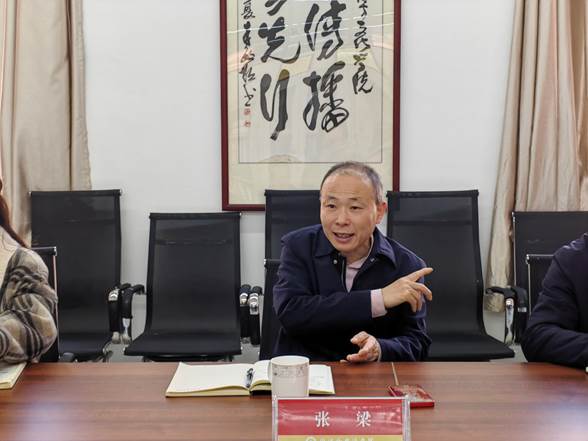 在听取马宏程关于学院基本情况的汇报后,张梁进一步了解了学院在人才结构、办公用房、发展规划等方面的现状与困境,肯定了学院在团队建设、国际传播等方面的工作,并介绍了学校未来几年的建设规划。会后,张董事长还带队实地考察了学院的教师办公场所,提出了指导性意见。