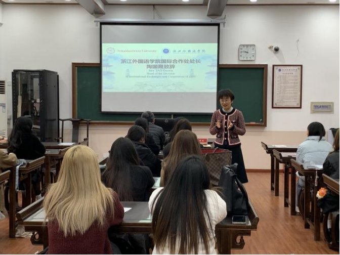陶国霞处长致欢迎辞。她回顾了两校过往的合作,同时表达了对本次冬令营的高度重视与支持。她指出,国际交流的本质是文化的传播,希望同学们成为文化传播的使者,向世界推广自己国家的优秀文化。最后,她鼓励同学们走出校园开展社会实践活动,留下自己探索的足迹,而不仅仅是在教室里聆听智慧的声音。同时她希望同学们积极和老师交流自己的想法,在沟通中成长与进步。
